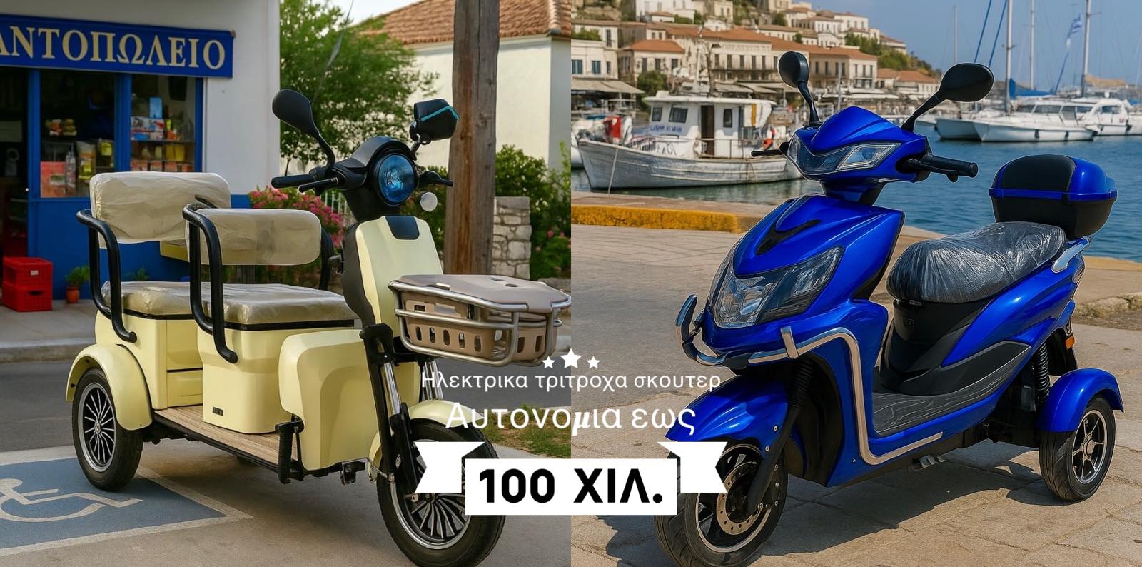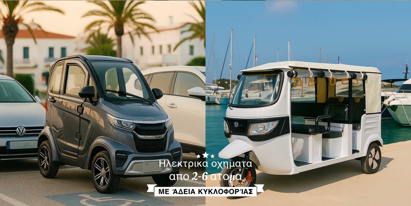 Δεν μένουμε όμως μόνο στα βενζινοκίνητα . Για τους λάτρεις των ηλεκτρικών οχημάτων ,έχουμε μεγάλη ποικιλία ηλεκτροκίνητων οχημάτων όπως ηλεκτρικά σκούτερ με 2-3 και 4 τροχούς , ποδήλατα και αυτοκίνητα τύπου golf car , resort cars , επιβατικά αλλά και με καρότσα .