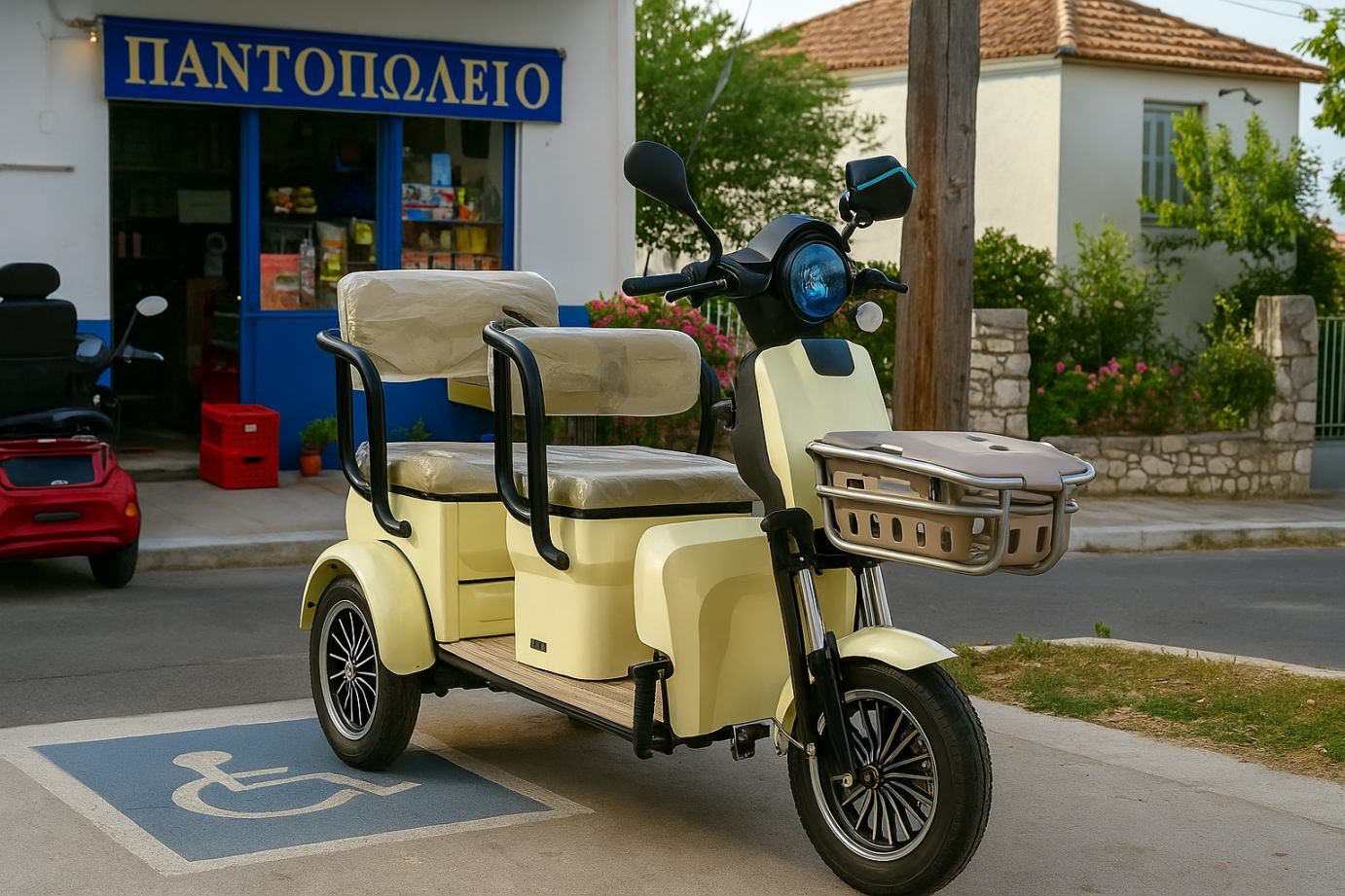 Ηλεκτρικό τρίτροχο σκούτερ με αυτονομία μέχρι 60 χιλιόμετρα . Με όπισθεν και ένα εργονομικό οπίσθιο κάθισμα που με μία κίνηση μετατρέπετε σε μικρή καρότσα για μεταφορά διαφόρων πραγμάτων
